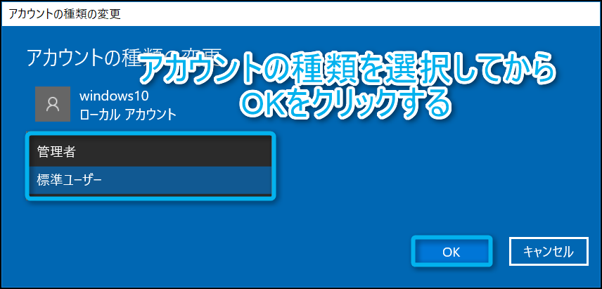 すると、管理者と標準ユーザーが選択出来るようになるね。今回は『管理者』を選択する。アカウントの種類を選択したら『OK』をクリックしよう。