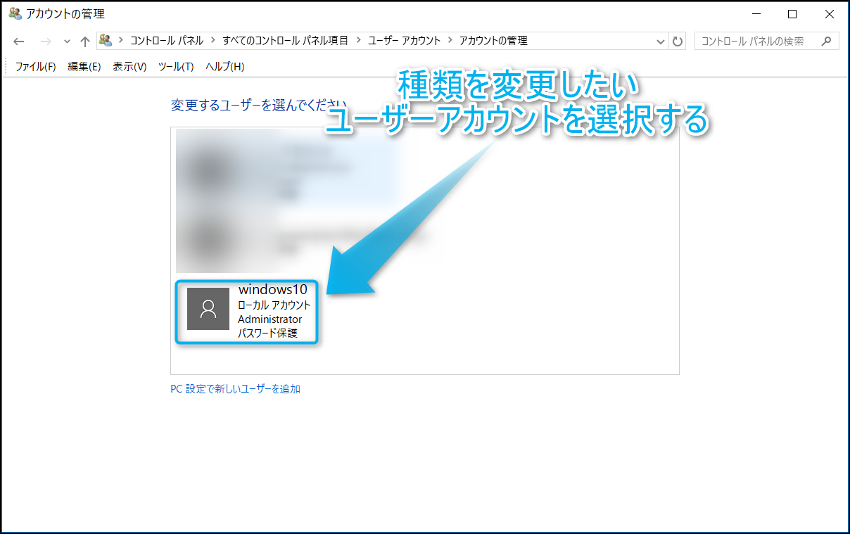 変更するユーザーを選択してください、という表示が出てくるから、これから種類を変更したいアカウントを選択しよう。