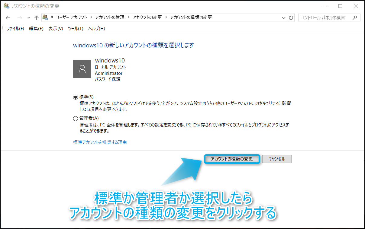 アカウントの種類の変更画面に進んだら、標準か管理者か選択して『アカウントの種類の変更』をクリックしよう。ここでは『標準』を選択していくね。
