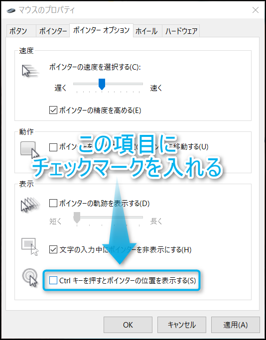 ポインターオプションのタブを開いたら、表示にある『Ctrlキーを押すとポインターの位置を表示する』にチェックマークを入れよう。デフォルトではチェックマークが外れた状態になっていると思う。