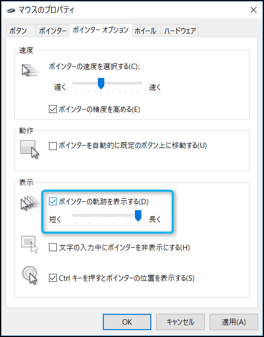 チェックマークを入れると、ポインターの軌跡の機能が有効になり、軌跡の設定が弄れるようになるよ。後は軌跡を長くするか短くするかだね。つまみはマウスのドラッグで自由に動かすことが出来るよ。