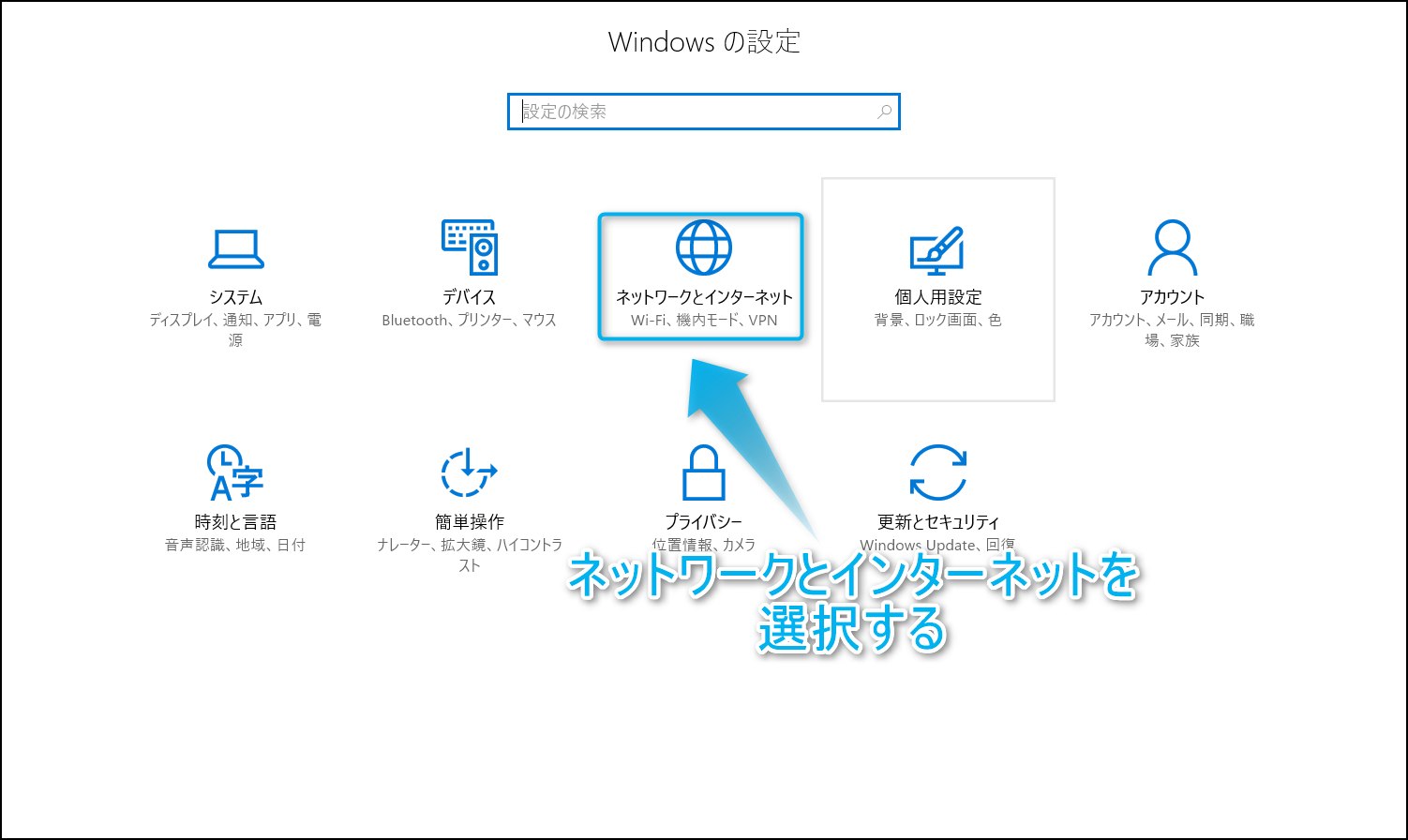 Windowsの設定画面を開いたら『ネットワークとインターネット』を選択して欲しい。