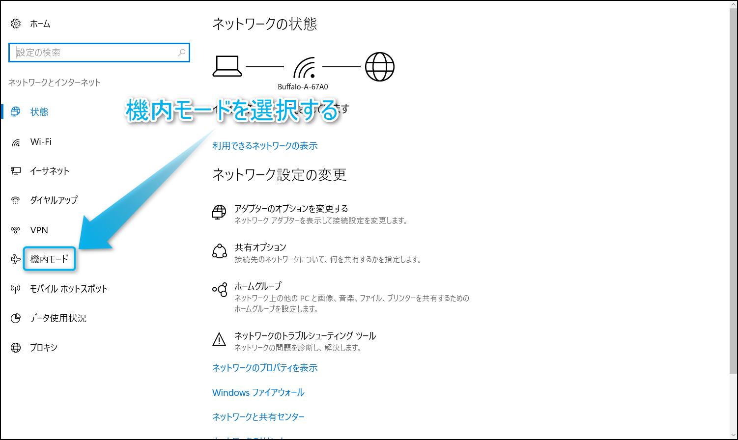 ネットワークとインターネットの画面を開いたら、左のメニューから『機内モード』を選択しよう。