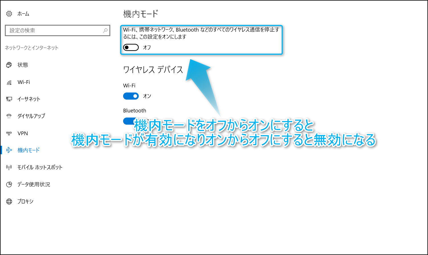 Windows10の機内モードは、何も弄っていない限り無効になっている。機内モードをオンにすると、Wi-Fi、携帯ネットワーク、Bluetoothなどのワイヤレス通信が全て切断されてしまうため、オンにしてしまうと不便な点が増えてしまうからね。