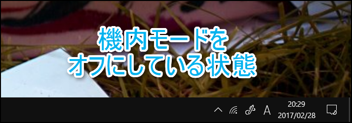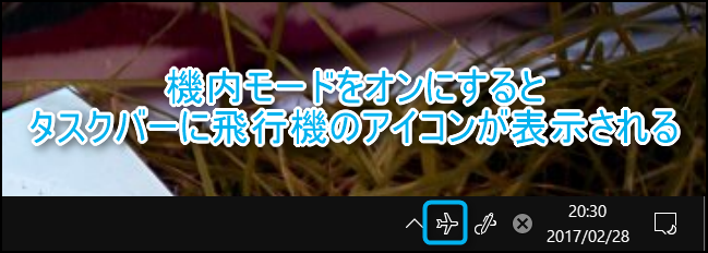 これが機内モードをオンにしている状態。タスクバーの通知領域に機内モードのアイコンが表示されるよ。飛行機のアイコンのね。