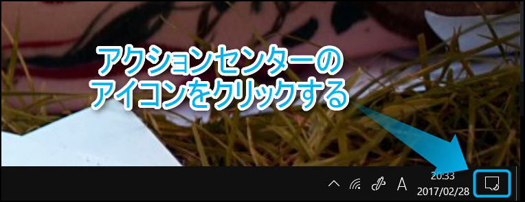まずは、タスクバー右端にある『アクションセンターのアイコン』をクリックするか、キーボードの『Windowsのロゴキー』+『A』を押して、アクションセンターの画面を開こう。