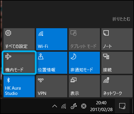 続いて、アクションセンターから機内モードをオン、オフに切り替える方法を紹介していくよ。