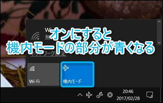 機内モードをオンにすると、背景が青くなり、タスクバーに機内モードのアイコンが表示されるようになるよ。
