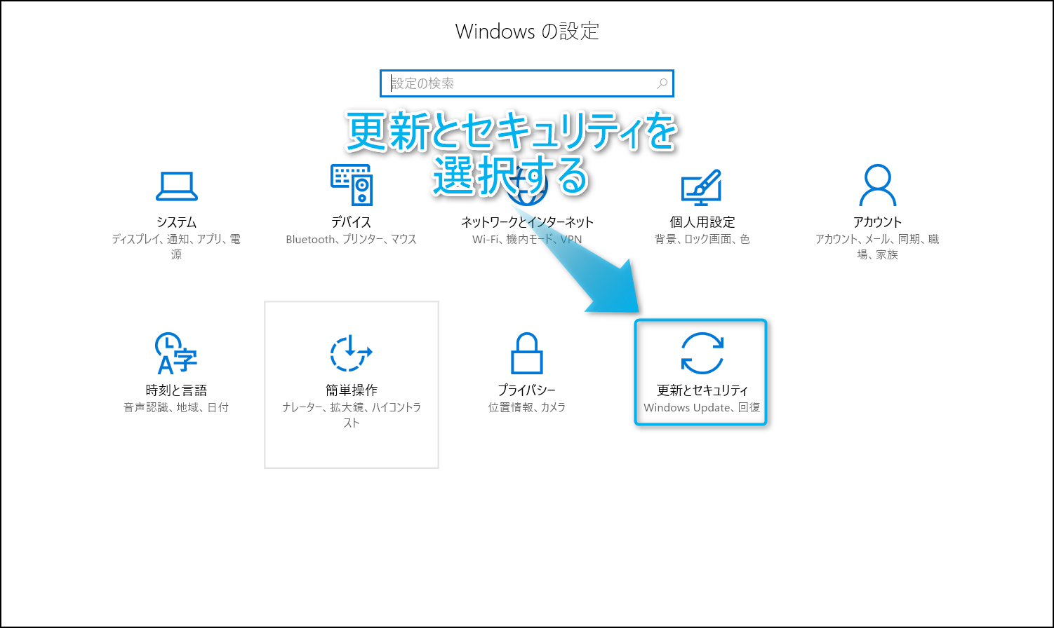 Windowsの設定画面を開いたら『更新とセキュリティ』を選択する。