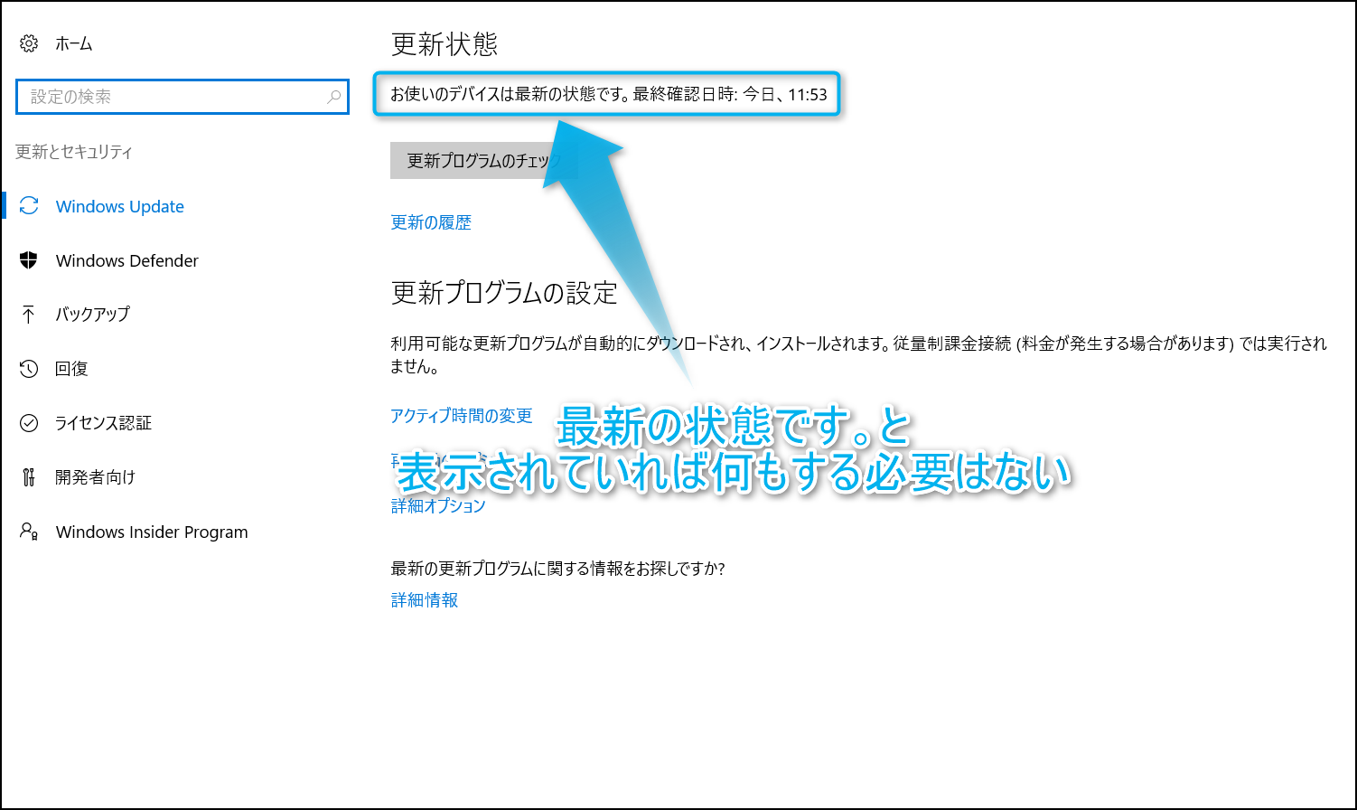 更新とセキュリティの画面を開いたら、更新状態を確認する。ここが『お使いのデバイスは最新の状態です。』という表示になっていればOKだよ。