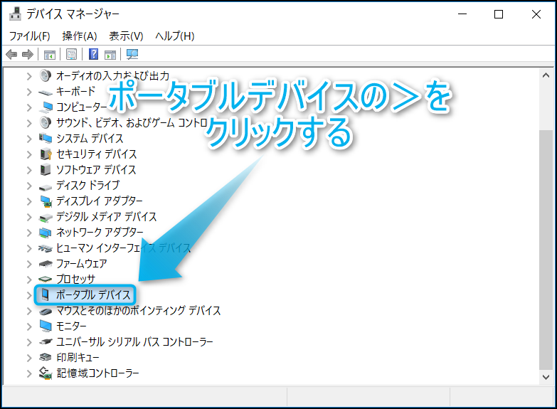 デバイスマネージャーの画面を開いたら『ポータブルデバイス』の左横にある『>』をクリックしよう。
