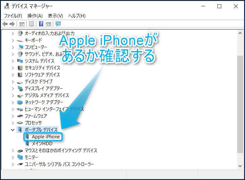 ポータブルデバイスの中身を展開させたら『Apple iPhone』があるか確認して欲しい。