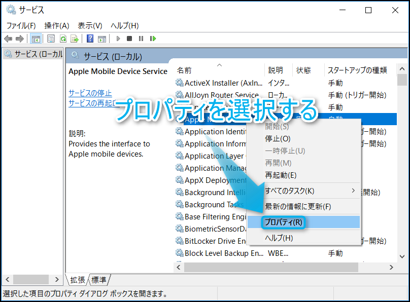 サービスの中から、Apple Mobile Device Serviceを選択して右クリックしてメニューを開いたら『プロパティ』をクリックしよう。