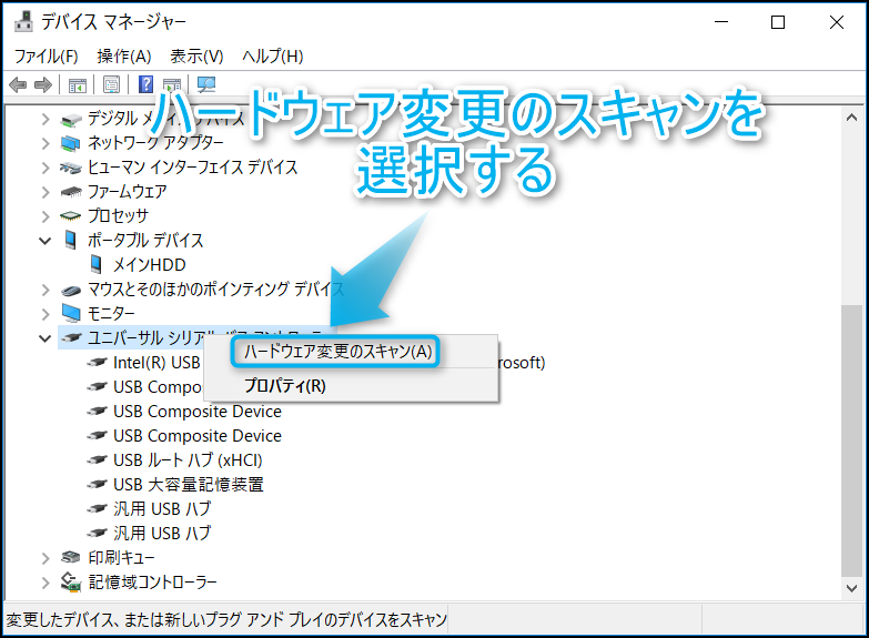 続いて『ユニバーサル シリアル バス コントローラー』を選択して右クリックしてメニューを表示させたら『ハードウェア変更のスキャン』をクリックしよう。