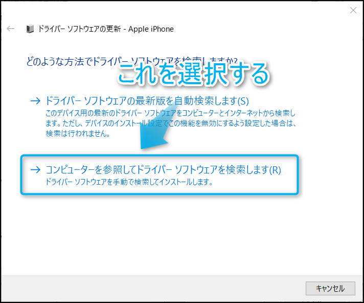 ドライバーソフトウェアの更新画面を開いたら『コンピューターを参照してドライバーソフトウェアを検索します』を選択しよう。
