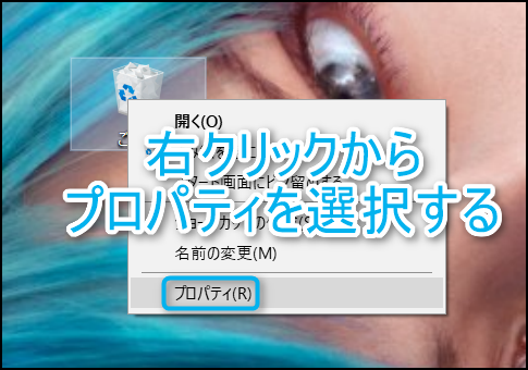 ゴミ箱のアイコンを選択した後、右クリックしてメニューを開き『プロパティ』を選択しよう。(Alt+Enterでもプロパティを開くことが出来るよ。)