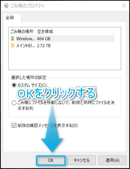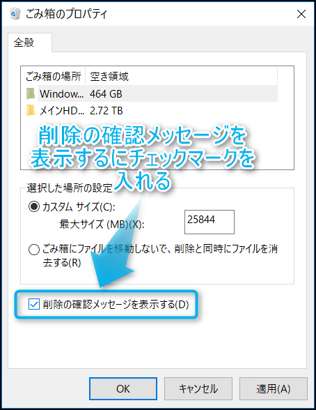 ここから、1番下にある『削除の確認メッセージを表示する』をクリックしてチェックマークを入れよう。チェックマークを入れるとメッセージが表示されるようになり、チェックマークを外すとメッセージが表示されなくなるよ。