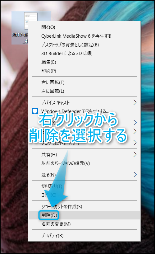 削除したいファイルを選択後、右クリックしてメニューを開き『削除』を選択しよう。(キーボードのDeleteキーを使って削除することも出来る。)