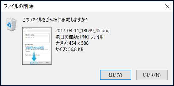 すると『このファイルをゴミ箱に移動しますか?』という小さなメッセージ画面が表示されるようになってると思う。削除したい場合は『はい(それかEnter)』、やっぱり削除をやめたい!って時は『いいえ』を選択しよう。
