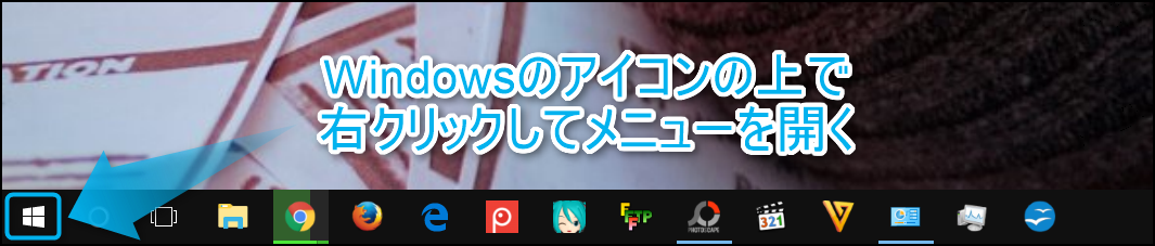 まずは、デスクトップ画面左下にある『Windowsのアイコン』の上で右クリックしてメニューを開こう。