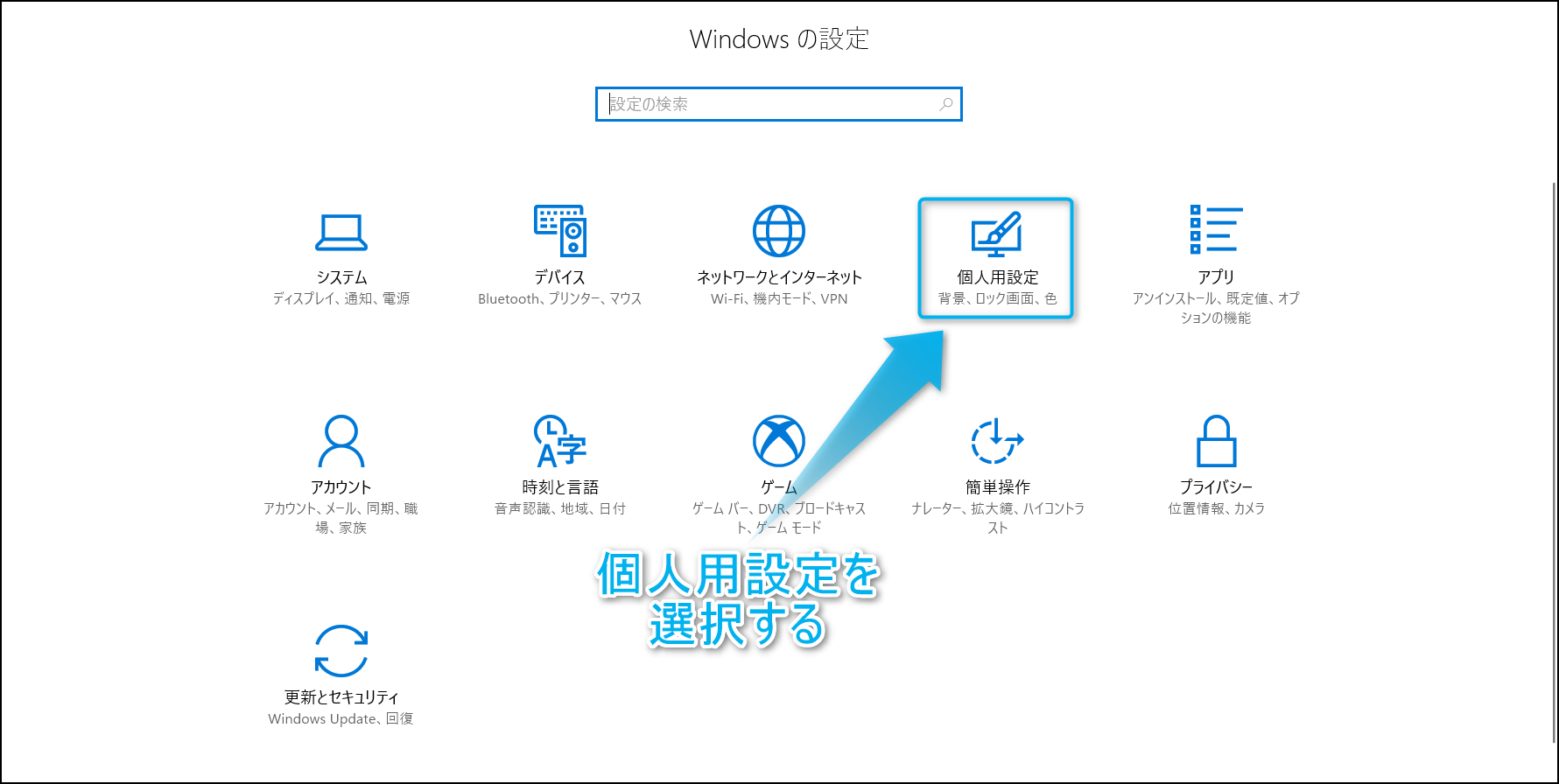 Windowsの設定画面を開いたら『個人用設定』を選択しよう。
