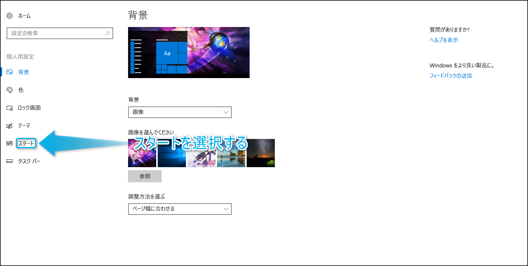 個人用設定の画面を開いたら、左のメニューから『スタート』を選択して欲しい。