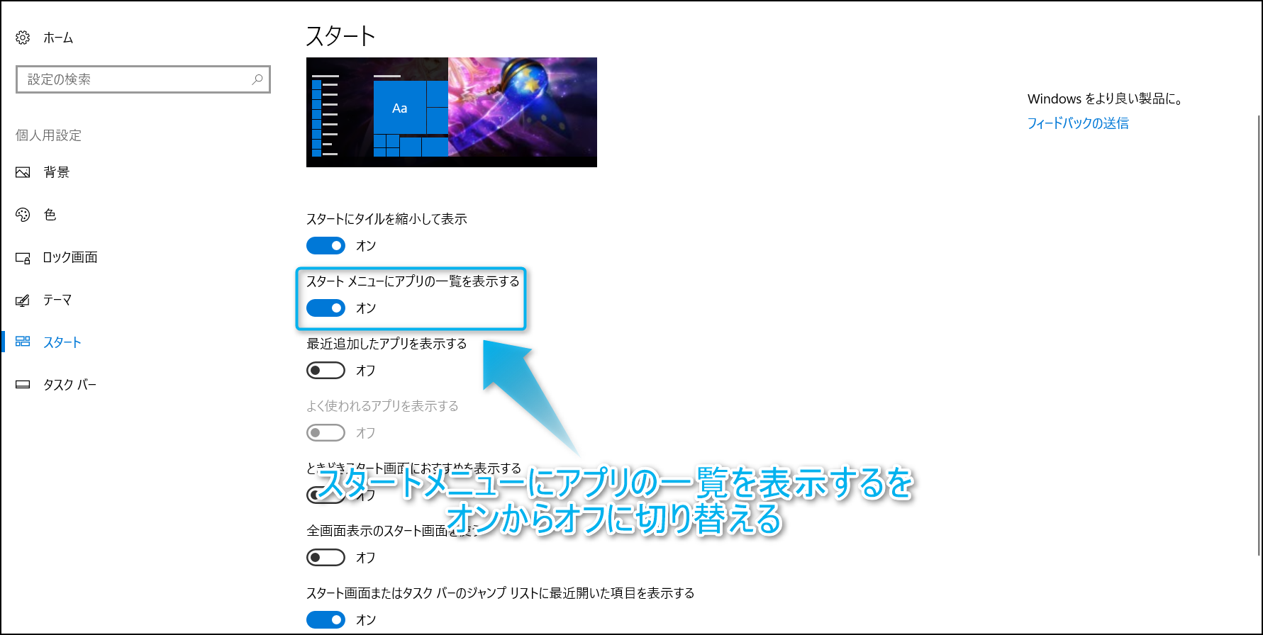 スタートの画面を開いたら『スタートメニューにアプリの一覧を表示する』をオンからオフに切り替えよう。オフにするとアプリの一覧を非表示にすることが出来るよ。逆にオンに切り替えるとアプリの一覧が表示される。