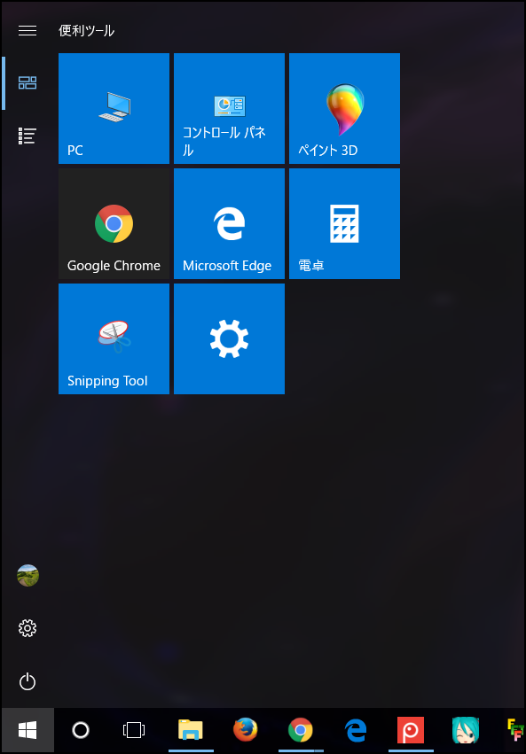 アプリの一覧を非表示にするとこんな感じ。スタートメニューにピン留めしたタイルだけが表示されるようになって凄くすっきりするね。