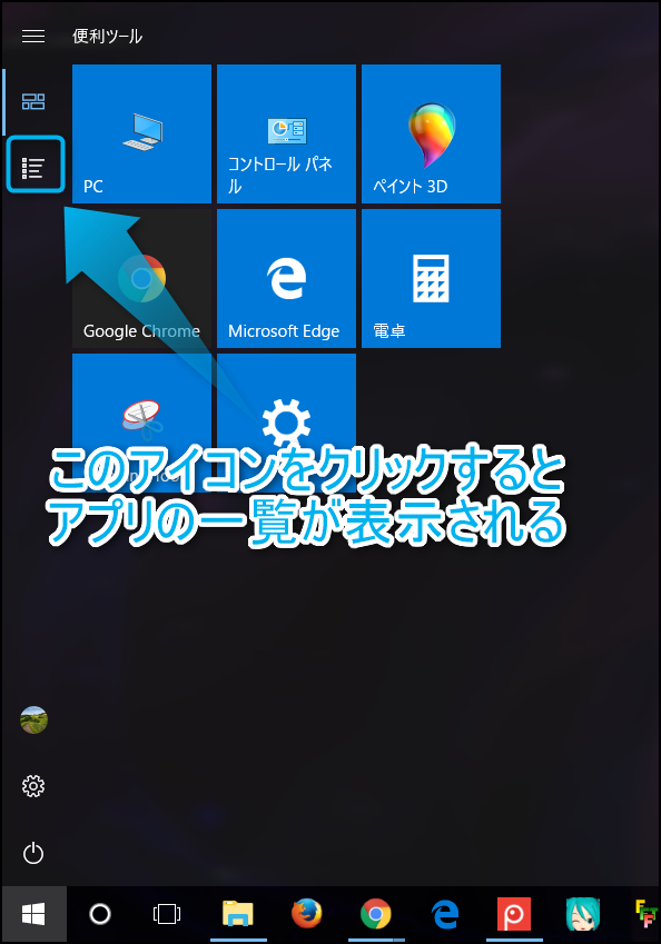スタートメニューを開いたら、左上にある『すべてのアプリのアイコン』をクリックしよう。これでアプリの一覧を表示させることが出来る。