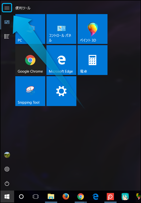 2つ目の方法。スタートメニューを開き、左上にある『展開のアイコン』をクリックしよう。