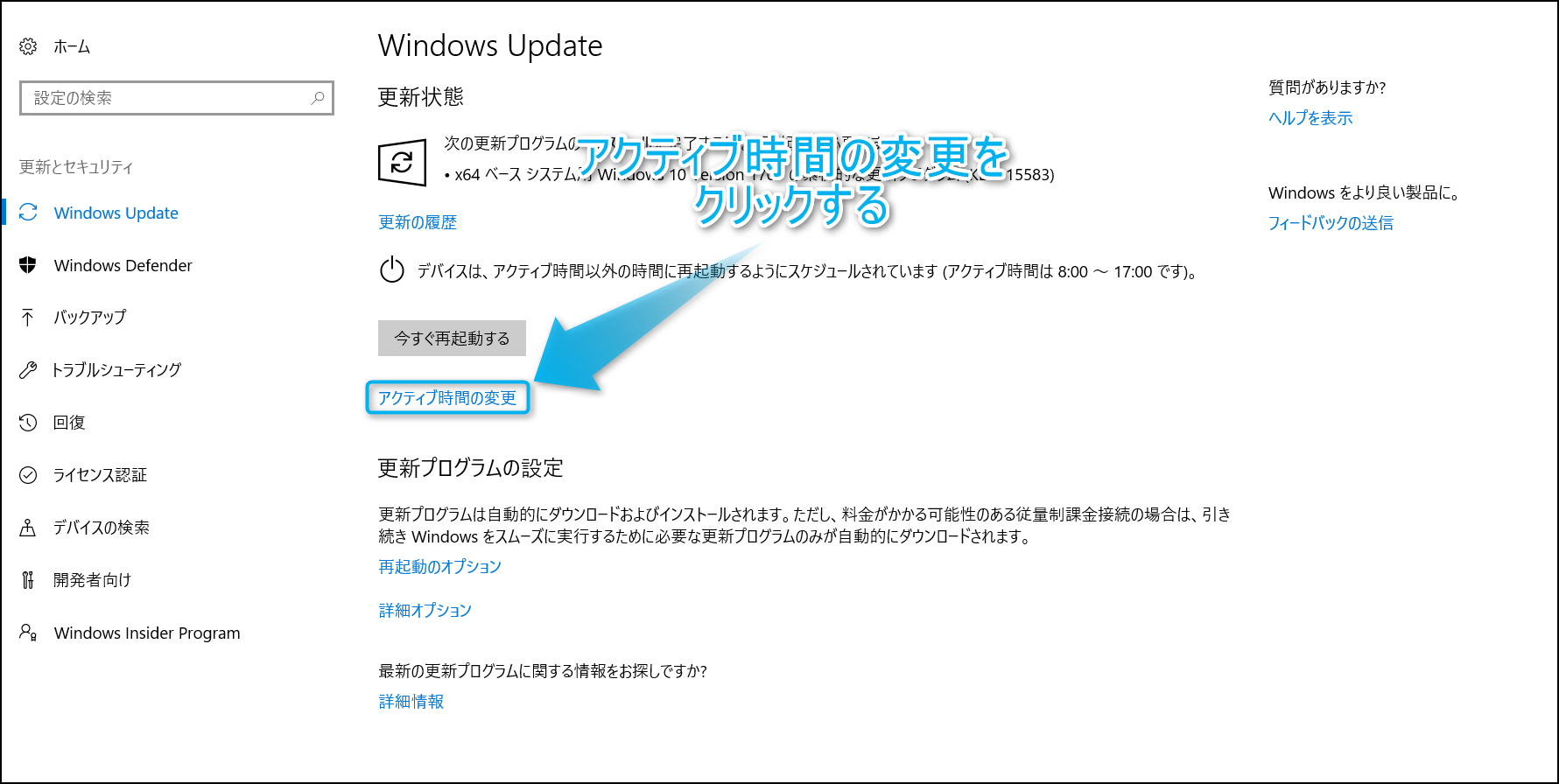 更新とセキュリティの画面を開いたら、左のメニューから『Windows Update』が選択されていることを確認してから『アクティブ時間の変更』をクリックして欲しい。