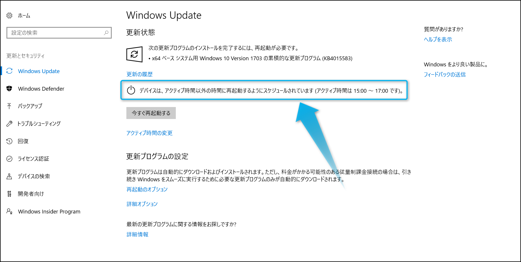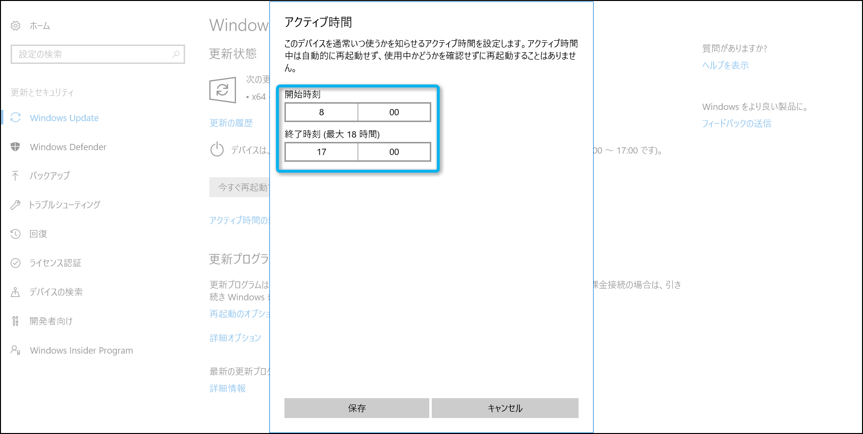 Windows10 Creators Updateでアクティブ時間の設定が18時間まで出来るようになり、アクティブ時間中は自動的に再起動されることがなく、使用中かどうか必ず確認してから再起動が行われる。