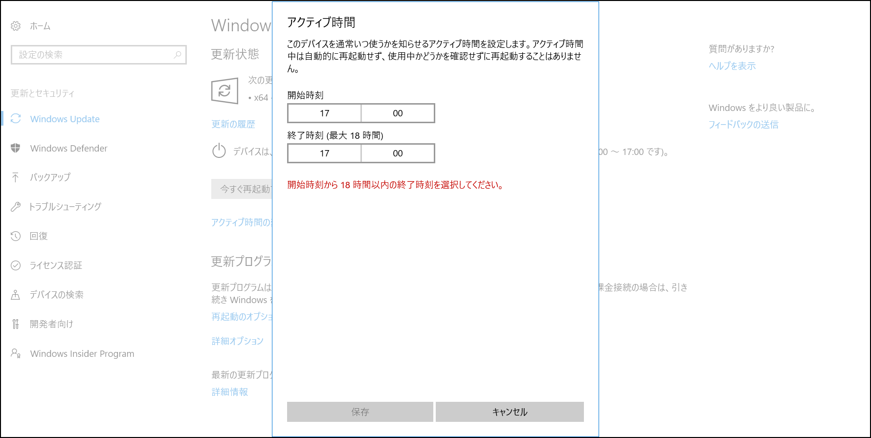 18時間を超える時間を設定すると『開始時刻から18時間以内の終了時刻を選択してください。』というエラーメッセージが表示される。もちろんこの場合は設定を保存することは出来ない。