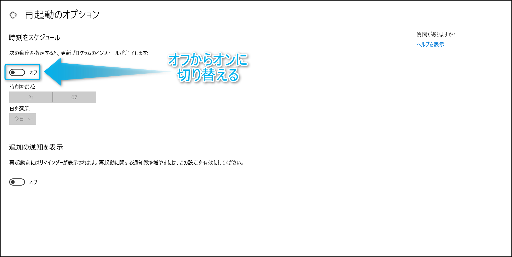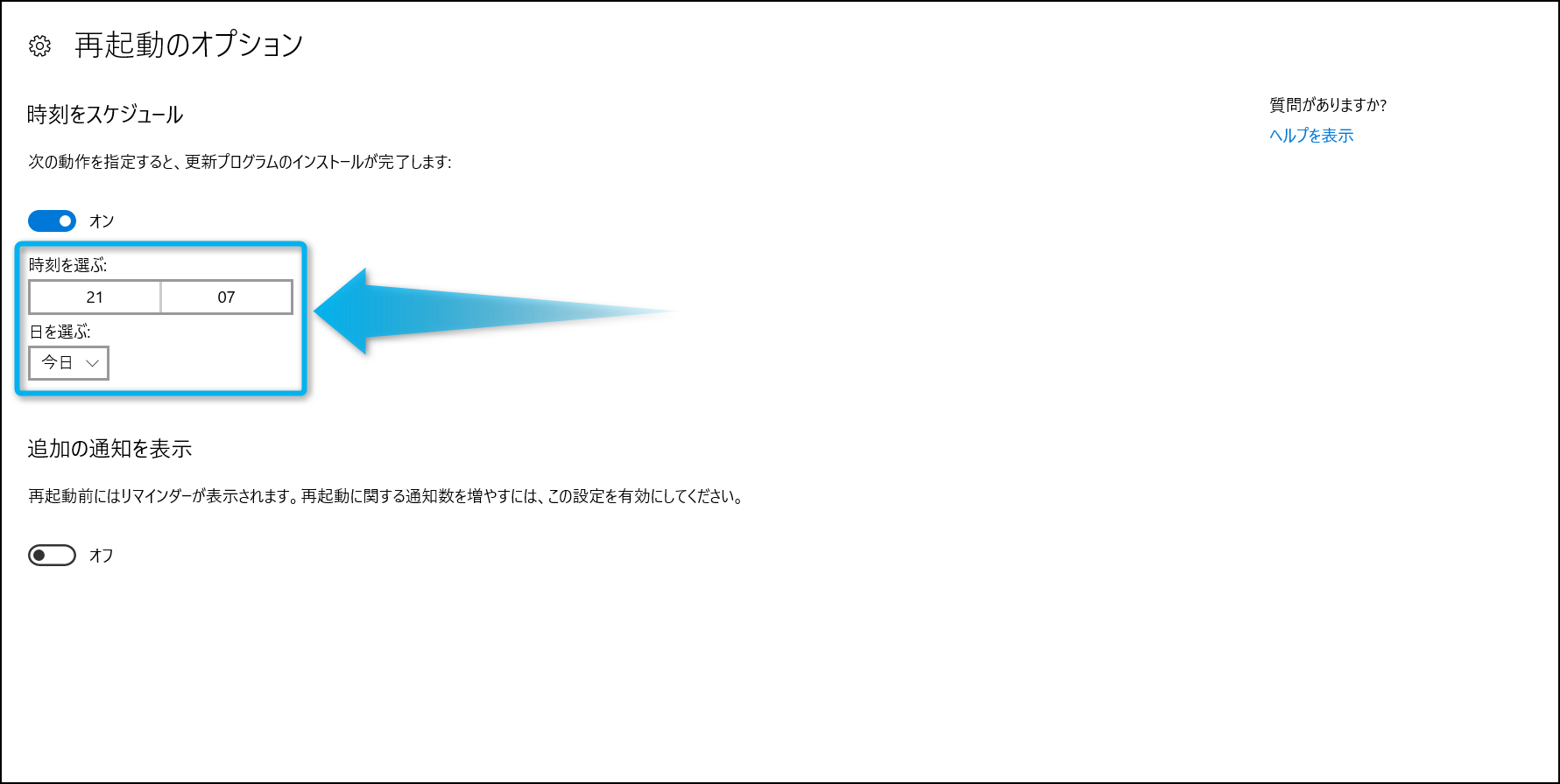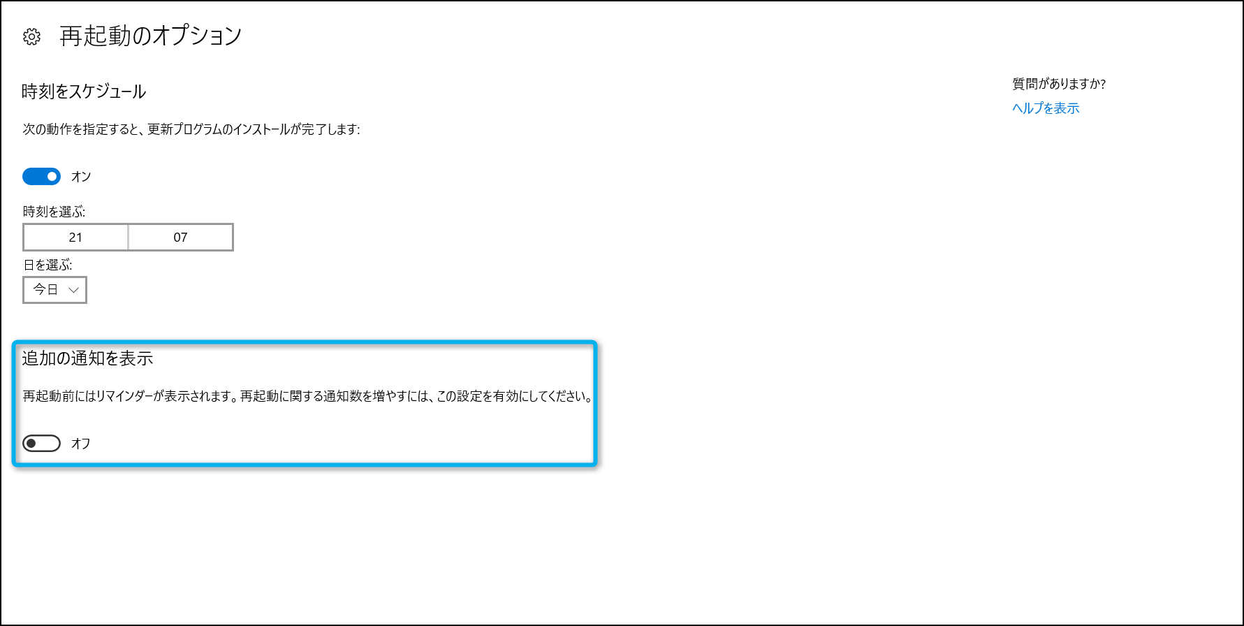 基本は時刻と日だけ設定すればいいんだけど、再起動に関する通知を増やしたい場合は『追加の通知を表示』の部分をオフからオンに切り替えておこう。
