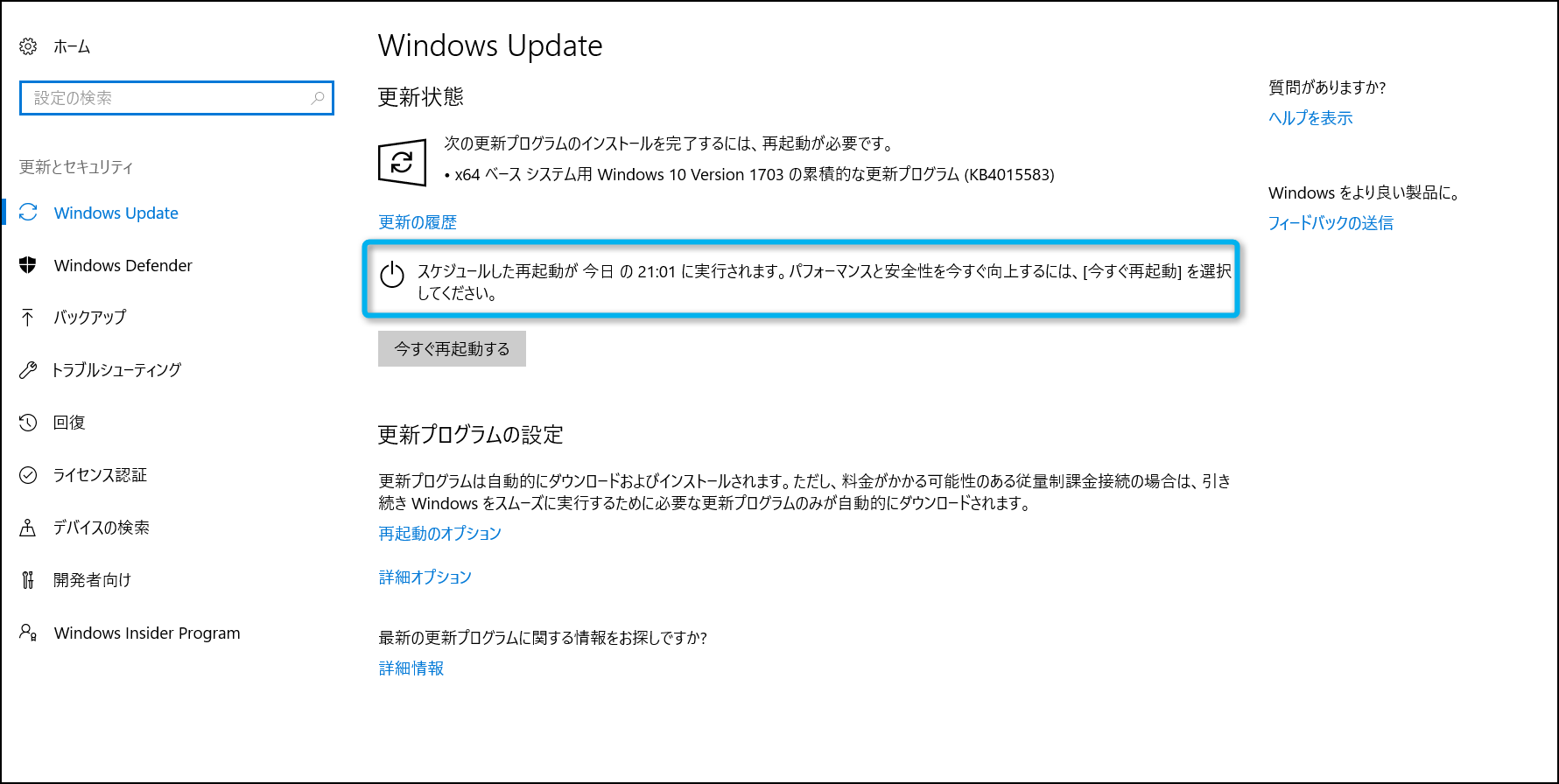 再起動オプションを設定すると、Windows Updateの画面にスケジュールした再起動の時刻が表示される。上の画像では21:01となっているのが分かると思う。