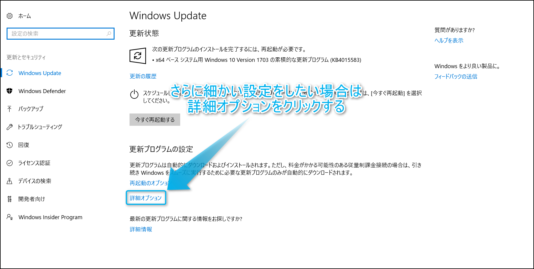 更新とセキュリティの画面を開いたら、左のメニューから『Windows Update』が選択されていることを確認して『更新プログラム設定』の項目にある『再起動オプション』をクリックしよう。