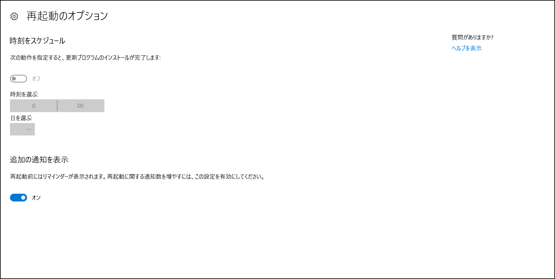 再起動が実行されて更新プログラムのインストールが終わると、再起動オプションはデフォルト状態に戻り、最新状態になった場合は再起動オプションが設定出来なくなるよ。(更新プログラムがない状態でも、追加の通知を表示の項目だけは弄ることが出来る。)