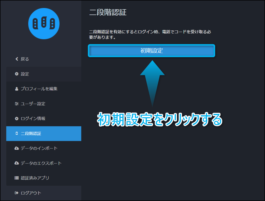 二段階認証の画面を開いたら『初期設定』をクリックしよう。二段階認証を使用するにはこの初期設定化が必ず必要になるからね。