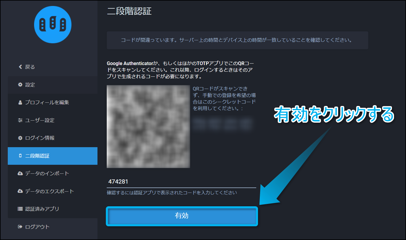 コードを入力したら『有効』をクリックして欲しい。