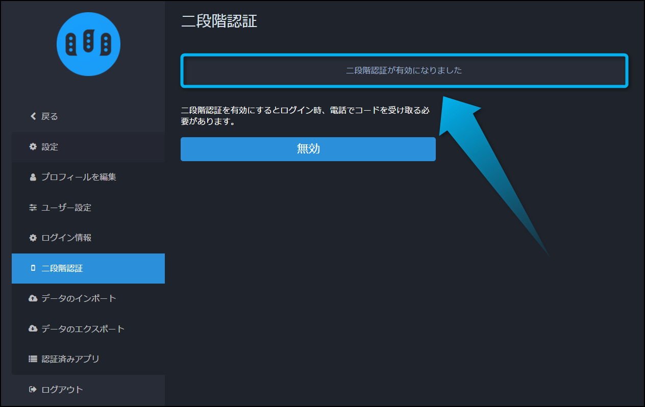 最後に『二段階認証が有効になりました』というメッセージが表示されたら、二段階認証の設定は完了だよ。
