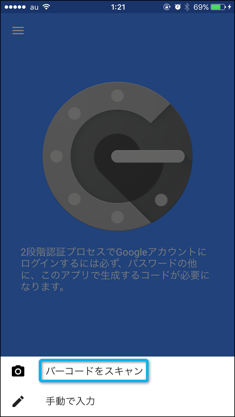 設定を開始をタップしたら『バーコードをスキャン』タップして欲しい。バーコードがスキャン出来ない場合などにシークレットコードを入力する時は『手動で入力』になるんだけど、今回はバーコードをスキャンする方を選択するね。