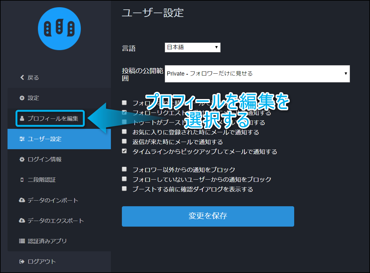 ユーザー設定の画面を開いたら、左側のメニューから『プロフィールを編集』をクリックして欲しい。