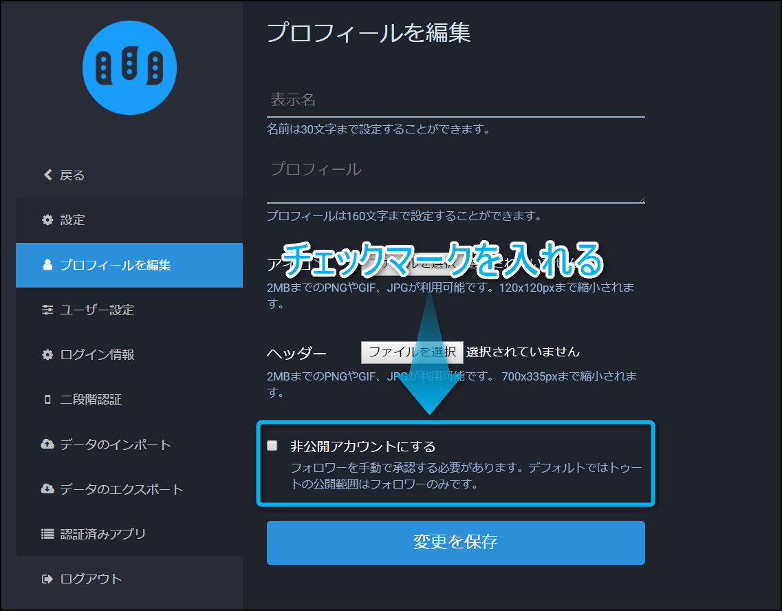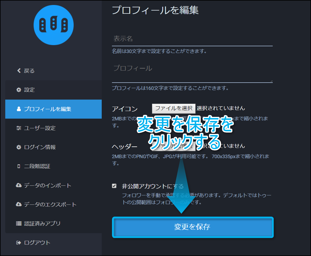 プロフィールを編集の画面を開いたら、画面下部にある『非公開アカウントにする』をクリックしてチェックマークを入れよう。
