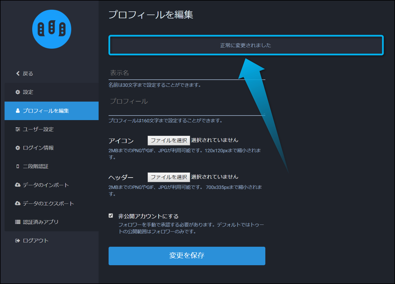 最後に『正常に変更されました』というメッセージが表示されればOKだよ。