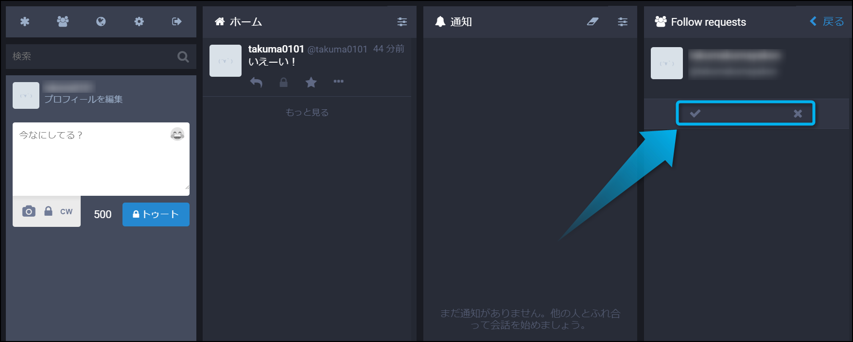 チェックマークのアイコンをクリックすると『許可』。バツのアイコンをクリックすると『フォローを拒否』することが出来るよ。