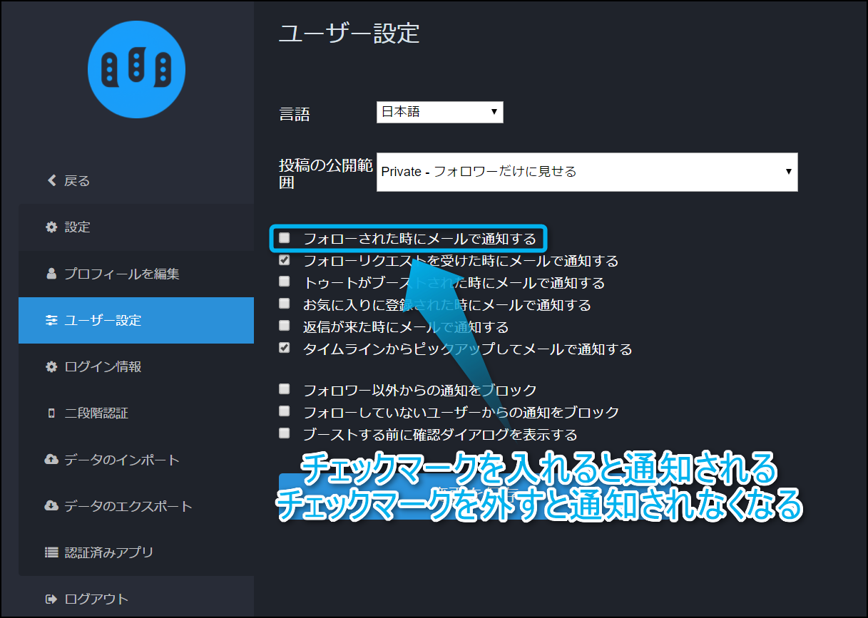 ユーザー設定の画面にある『フォローされた時にメールで通知する』をクリックしてチェックマークを付けると、誰かにフォローされた時にメールで通知されるようになるよ。