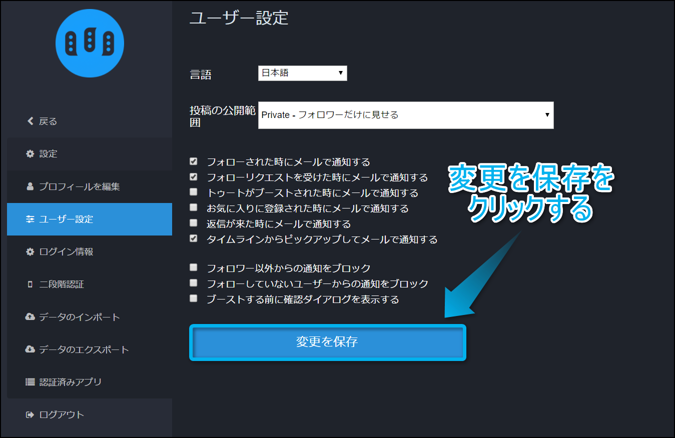 設定を変更したら『変更を保存』をクリックして欲しい。