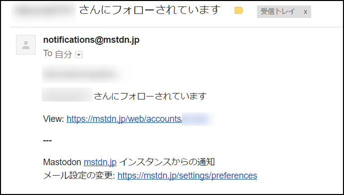 試しに2つアカウントを使ってフォロー通知の確認をしてみた。フォローした時に来るメールは上の画像の通り。フォローしてくれた人の名前が表示される。また、フォローしてくれた人のページのURLまで教えてくれる。これはありがたい。