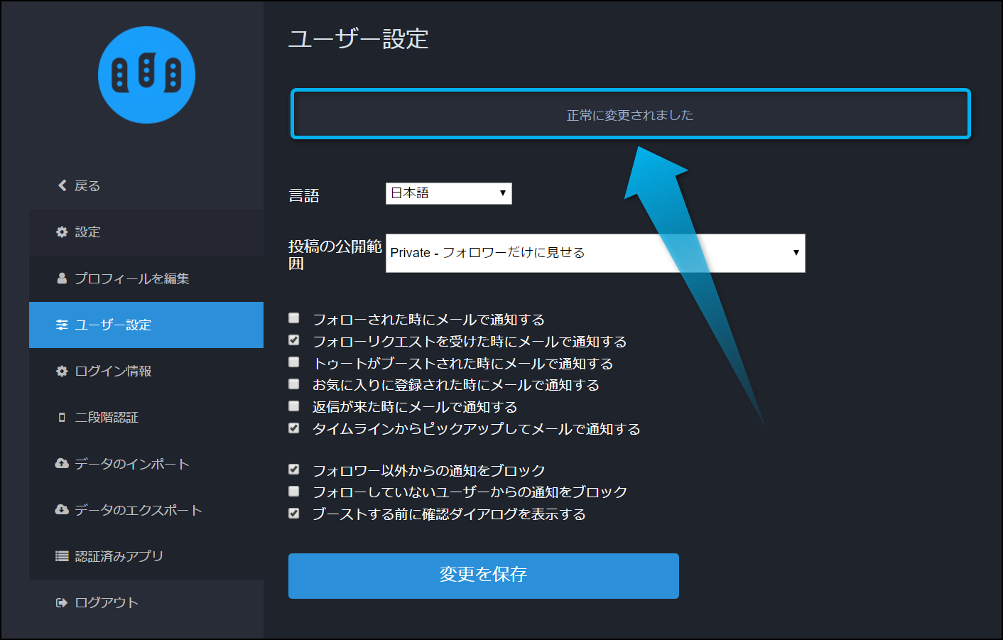 設定を変更したら『変更を保存』をクリックして欲しい。