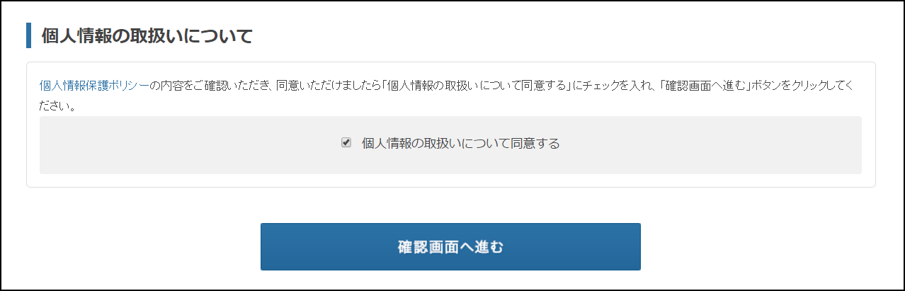 ここまで入力が終わったら『個人情報の取扱いについて同意する』にチェックマークを入れて『確認画面へ進む』をクリックして欲しい。